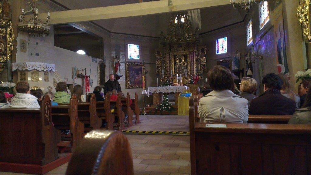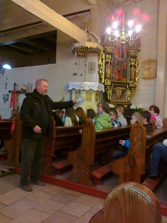 O godzinie 9.15 autobus z laureatami przybył do naszego parafialnego kościoła. Gości powitał Ks. Proboszcz Jan Palus. Pokazał przybyłym wnętrze świątyni, opowiedział o przeprowadzonych rekonstrukcjach, które miały miejsce w naszym kościele, przedstawił różne ciekawostki. Pokazał kościół, kaplicę i otoczenie zwiedzającym. Zaprowadził dzieci i młodzież do wieży. Na pamiątkę pobytu w poniszowickim kościele goście otrzymali pocztówki przedstawiające nasz kościół oraz jego wnętrze. Na zakończenie ponad godzinnej wizyty w naszym parafialnym kościele ks. proboszcz zaprosił na ponowną wizytę. O godz. 10.15 laureaci pojechali do następnych zabytkowych kościołów w powiecie gliwickim.