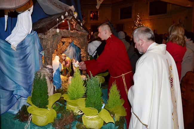 Pasterce przewodniczył ks. proboszcz Jan Palus. O godz. 24:00 ks. proboszcz wniósł dzieciątko Jezus i położył je w stajence. Dalej przy śpiewie kolęd rozpoczęliśmy Pasterkę.