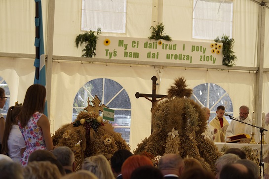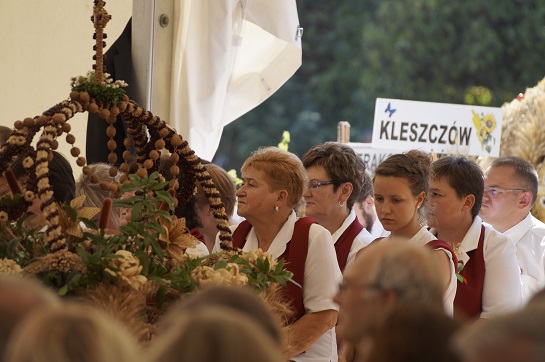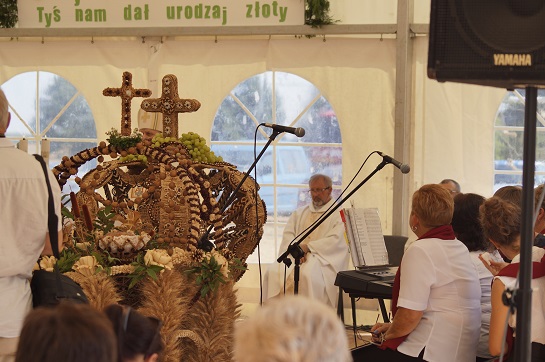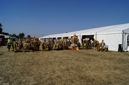 Zanim rozpoczęła się Msza święta na placu dożynkowym, zaprezentowano wszystkie korony, a potem ustawiono obok wejścia do głównego namiotu.