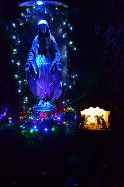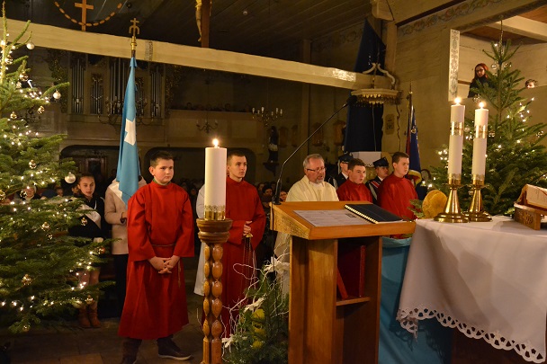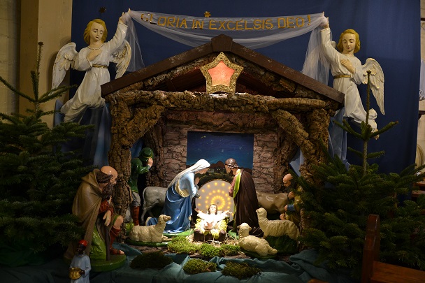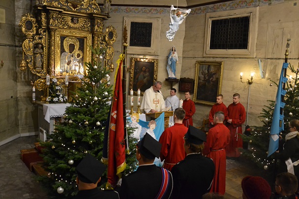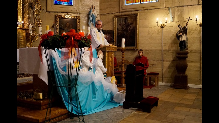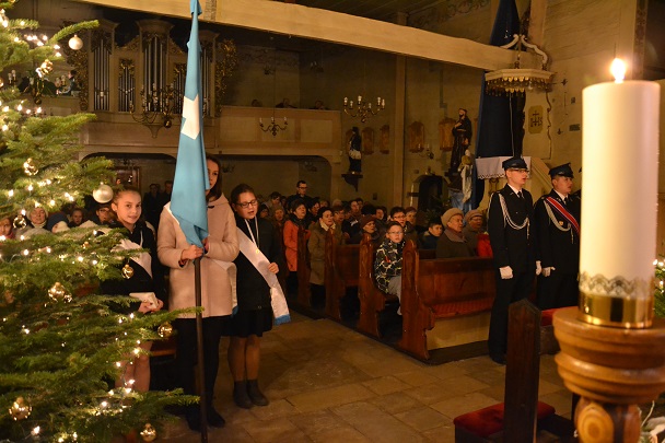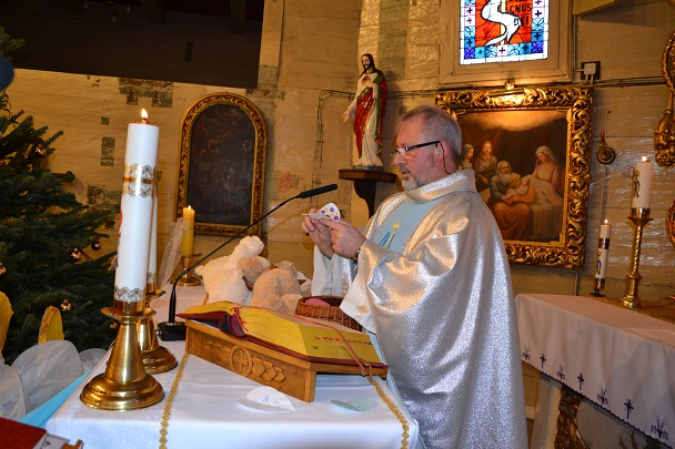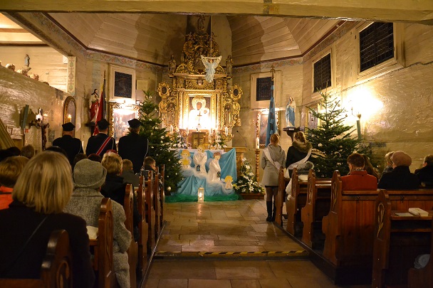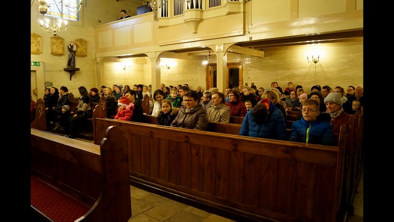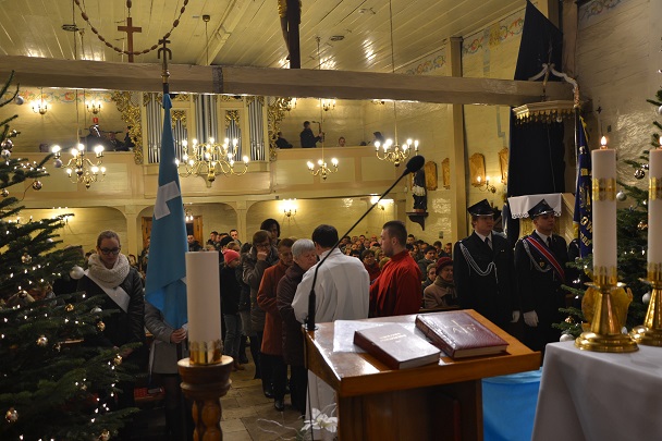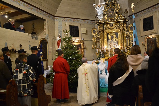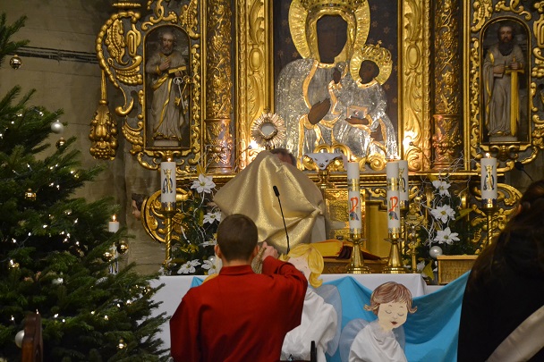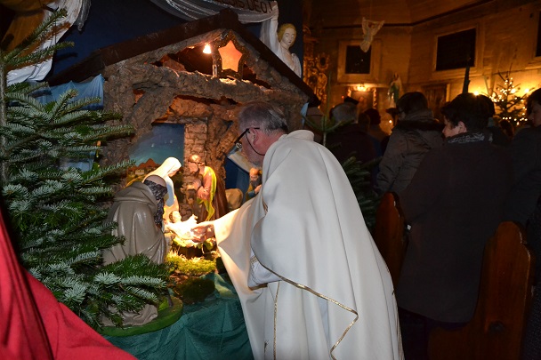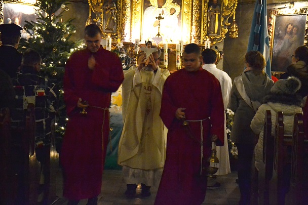 Msza św. rozpoczęła się wejściem w ciemnościach z figurką Pana Jezusa, niesionego przez ks. proboszcza. Po złożeniu Dzieciątka do żłóbka rozświetliła się szopka i dekoracje świąteczne, a reszta świateł na Gloria in excelsis.