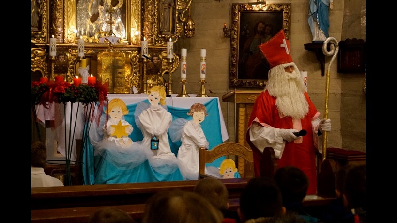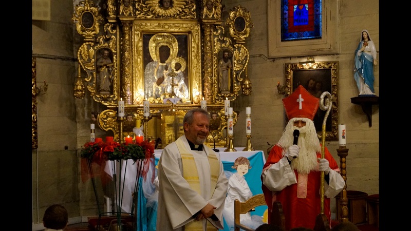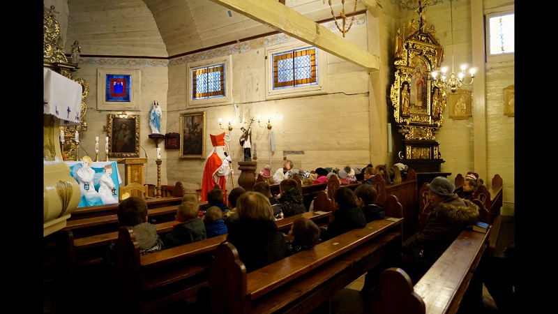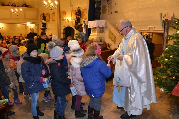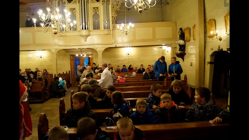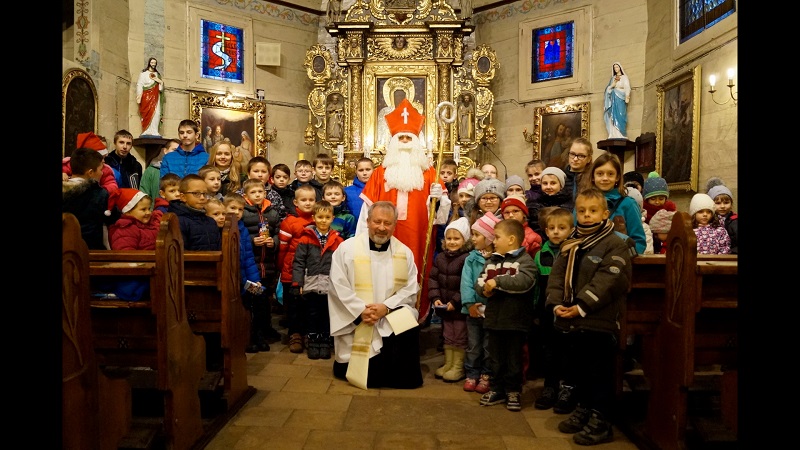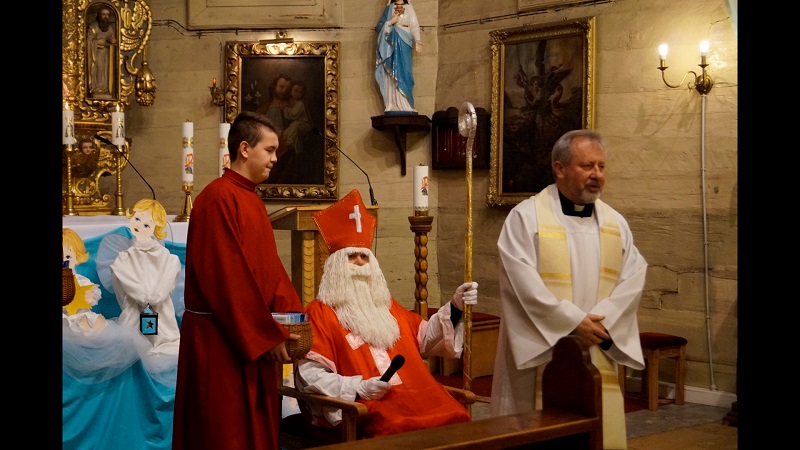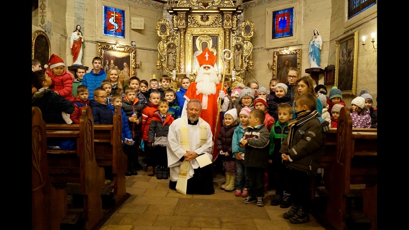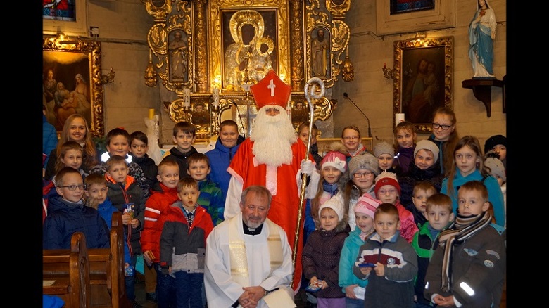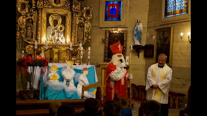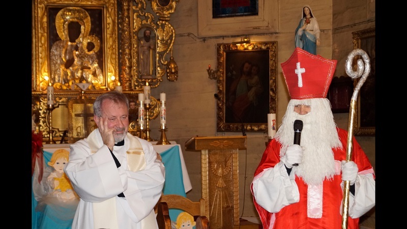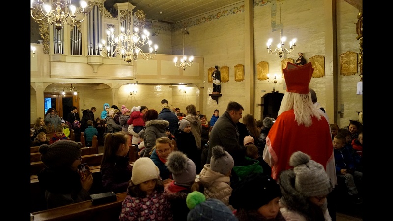 W niedzielę, 6 grudnia w naszej parafii podczas Nabożeństwa Adwentowego mieliśmy okazję spotkać się ze świętym Mikołajem. Niesamowite jest jego poświęcenie dla naszej wspólnoty, przebył tyle kilometrów, aby spotkać się z nami wszystkimi. Wszedł od strony zakrystii wnosząc do Świątyni wiele radości, uśmiechu na twarzy, wprowadzając nas w świąteczną atmosferę. Serdecznie przywitał się z nami wszystkimi. Powiedział kilka zdań o sobie, że jest biskupem i przybywa z bardzo daleka. Zadał najmłodszym kilka pytań, aby ich troszkę poznać i oczywiście dowiedzieć się czy byli grzeczni.
