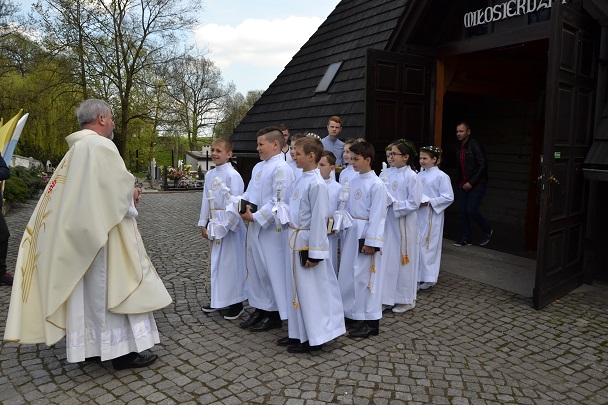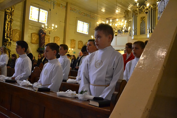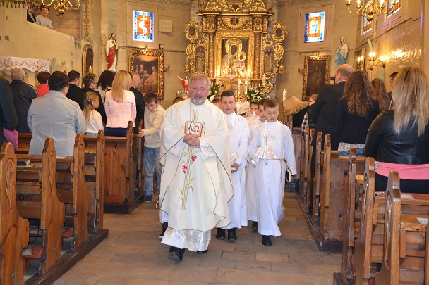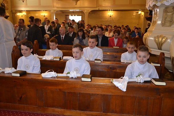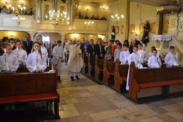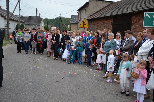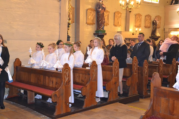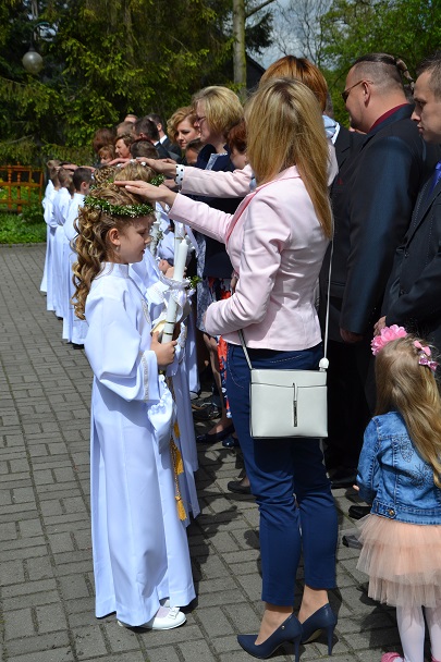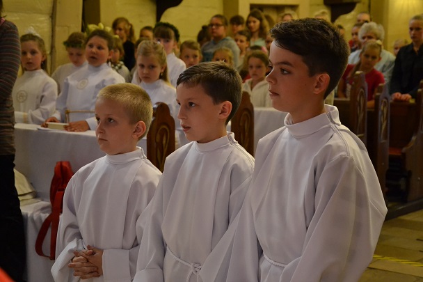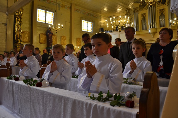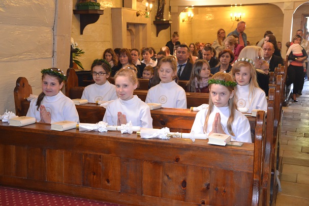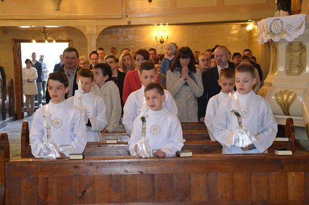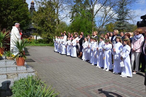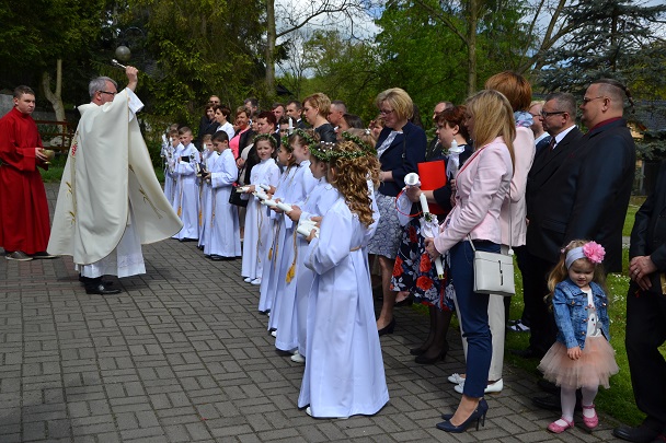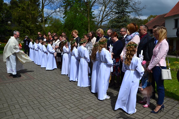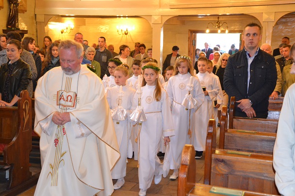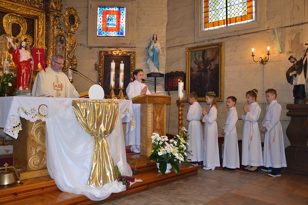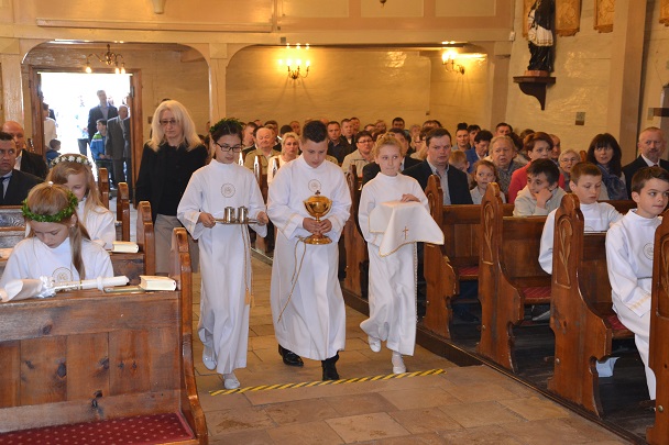 Dzieci wraz z rodzicami zebrały się przed budynkiem plebanii. Ksiądz Proboszcz powitał wszystkich, a dzieci na pamiątkę ich chrztu pokropił wodą święconą. Dzieci poprosiły rodziców o błogosławieństwo. Po uroczystym błogosławieństwie nastąpiło przejście procesją do kościoła. Dzieci zaangażowane w liturgię wraz ze swymi bliskimi uczestniczyły w uroczystej Eucharystii, w czasie której po raz pierwszy przyjęły do swoich serc Pana Jezusa.