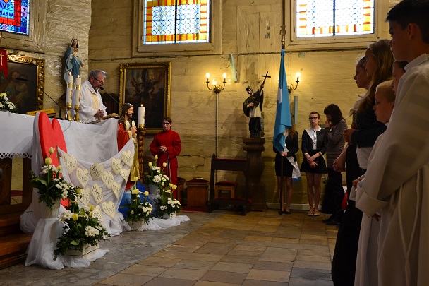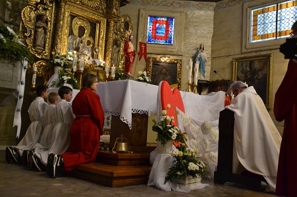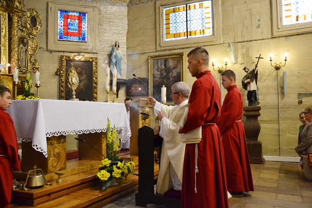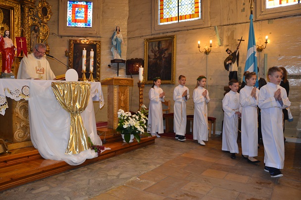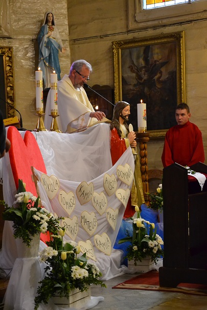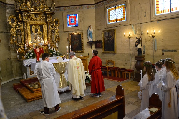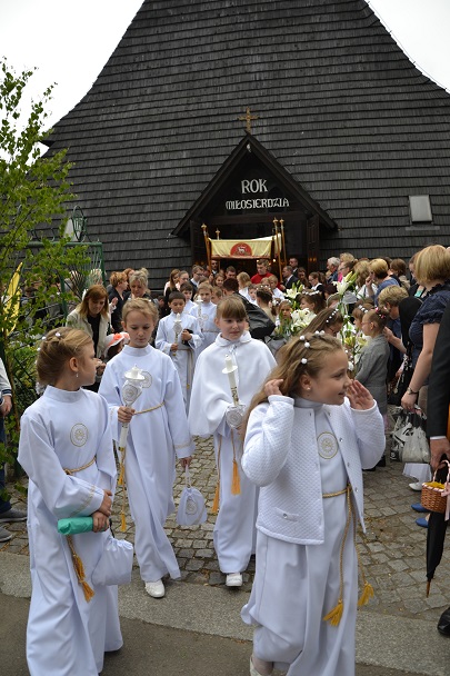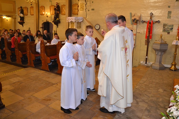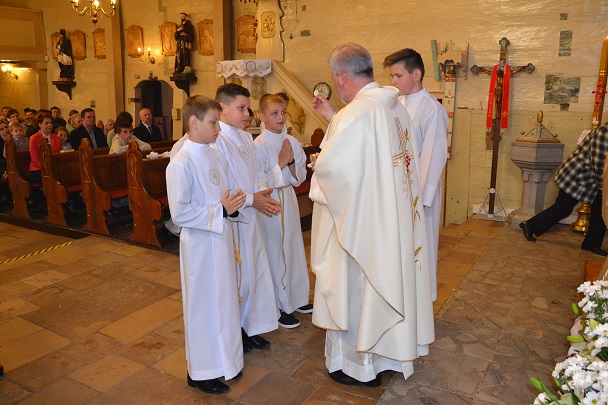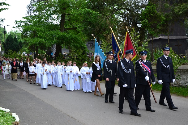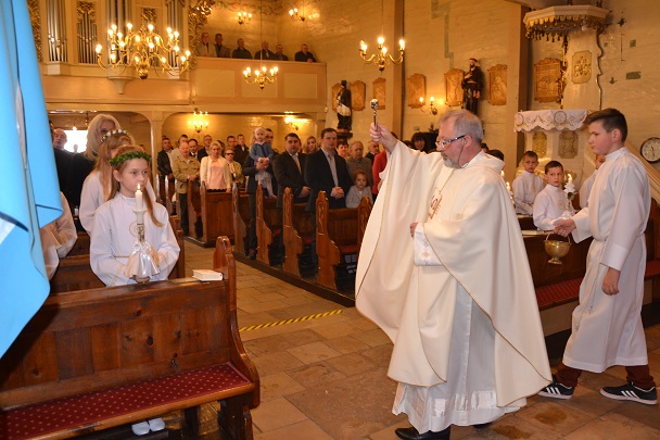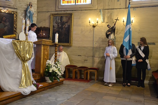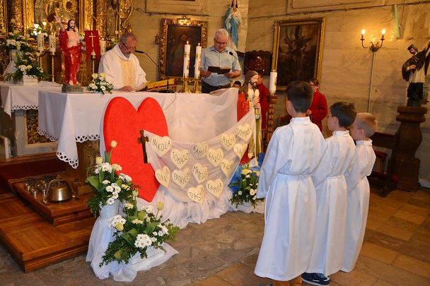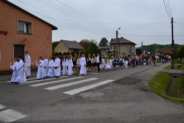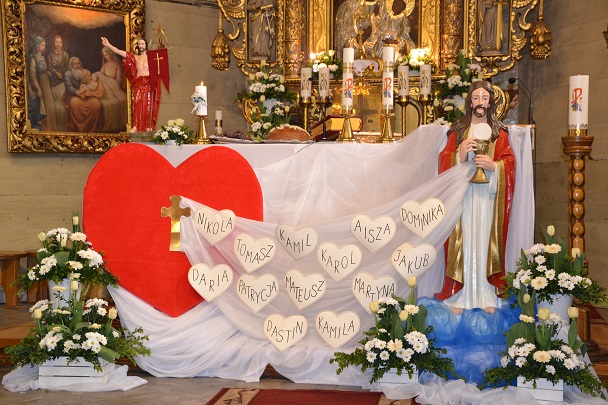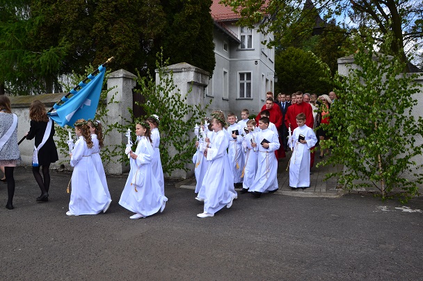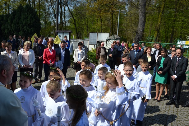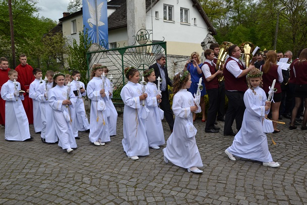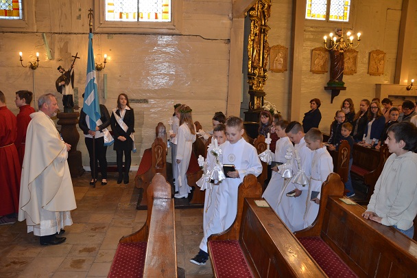 Dzieci wraz z rodzicami zebrały się przed budynkiem plebanii. Ksiądz Proboszcz powitał wszystkich, a dzieci na pamiątkę ich chrztu pokropił wodą święconą. Dzieci poprosiły rodziców o błogosławieństwo. Po uroczystym błogosławieństwie nastąpiło przejście procesją do kościoła. Dzieci zaangażowane w liturgię wraz ze swymi bliskimi uczestniczyły w uroczystej Eucharystii, w czasie której po raz pierwszy przyjęły do swoich serc Pana Jezusa.