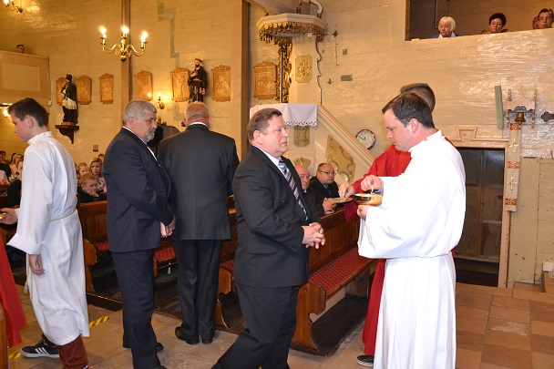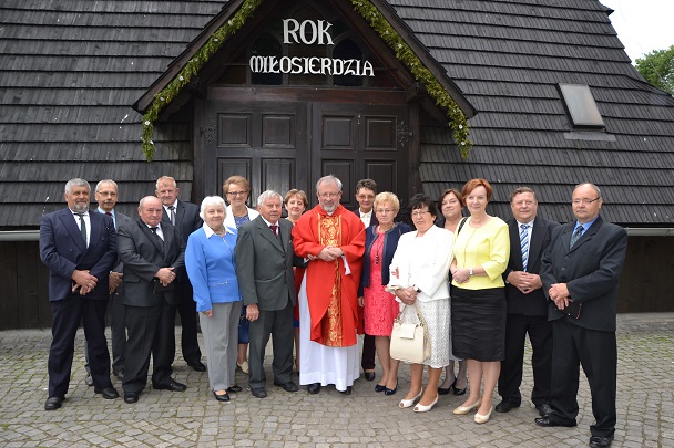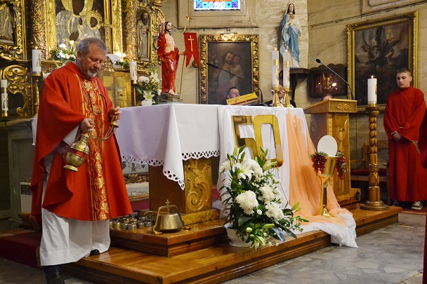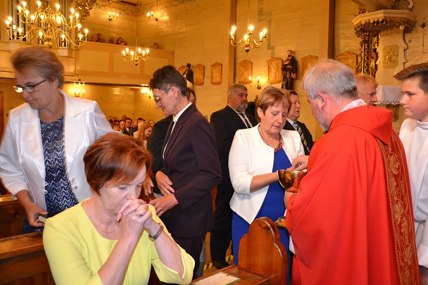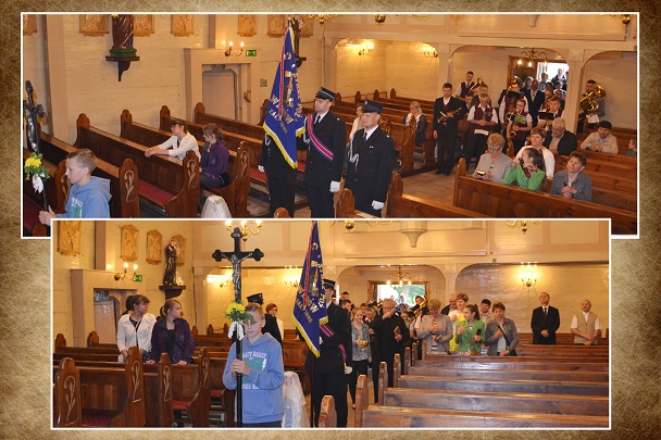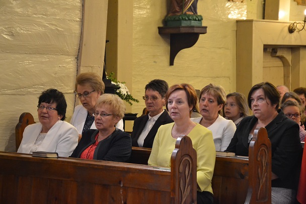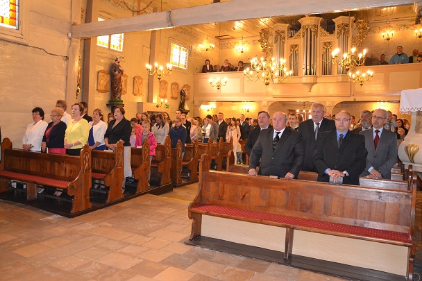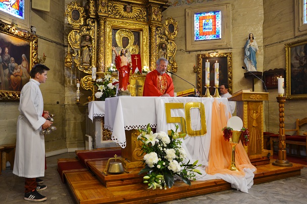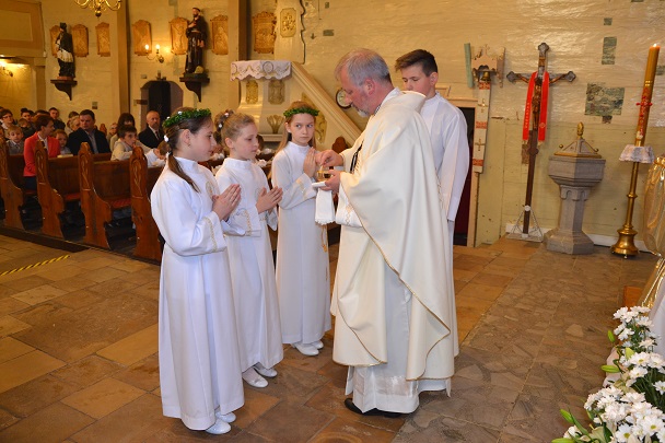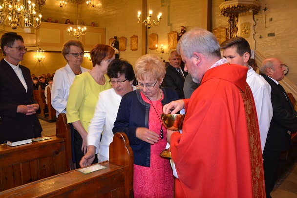 Z tej okazji została odprawiona uroczysta Msza św. o godz.11.00 w naszym parafialnym kościele , gdzie 50 lat temu ówczesne dzieci przyjęły po raz pierwszy Komunię św. z rąk swego proboszcza ks. Konstantego Adlera. Niedzielną Mszę św. odprawił proboszcz ks. Jan Palus, wygłosił też Słowo Boże do zgromadzonych wiernych, a w szczególności do Jubilatów. Podczas Mszy św. modliliśmy się w intencji wszystkich jubilatów, tych obecnych, a także za tych, którzy z różnych względów nie mogli przybyć na tę uroczystość oraz za tych, którzy już odeszli do wieczności. Modliliśmy się także za kapłanów, którzy 50 lat temu posługiwali w naszej parafii.