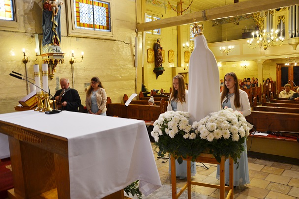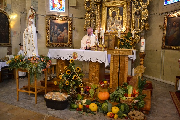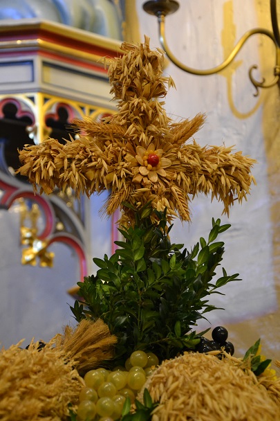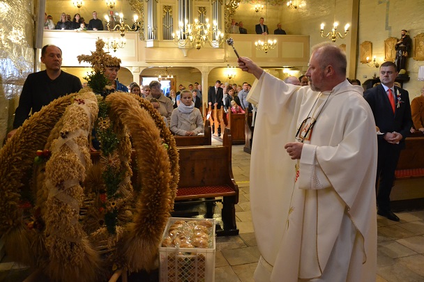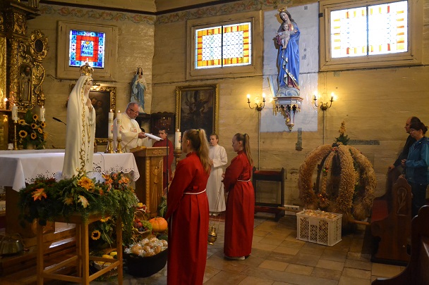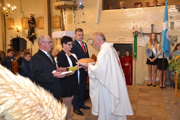 Podczas Mszy św. poświęcona została korona dożynkowa, chleb i bułki oraz wszystkie dary, złożone przed ołtarzem Pańskim, przez parafian z Niewieszy. Dziękujemy im za świadectwo wiary i kunsztu artystycznego. Uroczysta liturgia dożynkowa była okazją do modlitwy w intencji rolników. Prosiliśmy o Boże Błogosławieństwo i opiekę Matki Bożej dla wszystkich parafian. Oprócz dziękczynienia za tegoroczne plony prosiliśmy również o Boże Błogosławieństwo w tej niełatwej pracy na kolejny rok. Mszy św. przewodniczył proboszcz ks. Jan Palus . Podczas tej uroczystości nie mogło zabraknąć dziękczynnego hymnu „Te Deum Laudamus", zaś po Komunii św. Starostowie dożynkowi tradycyjnie przekazali bochen chleba z tegorocznej mąki na ręce księdza proboszcza.