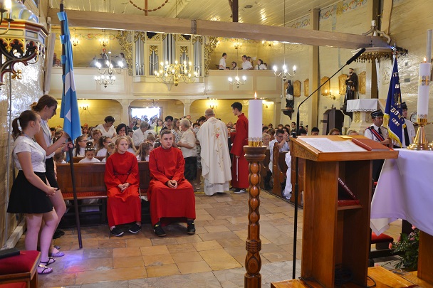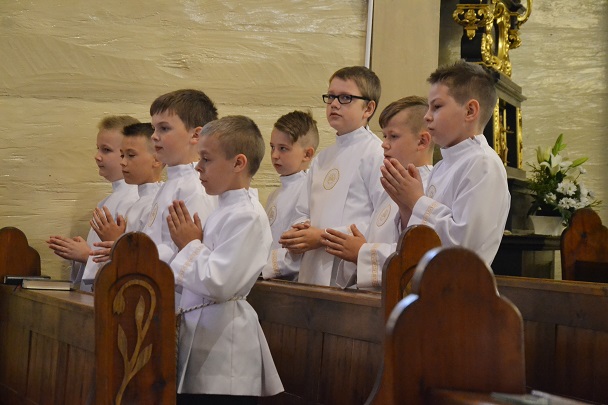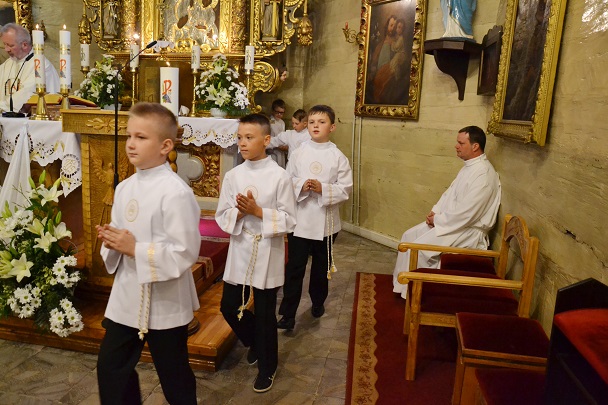 06 maja w naszym parafialnym kościele dzieci klas czwartych w czasie Mszy św. o godzinie 11.00, świętowały rocznicę przystąpienia do Pierwszej Komunii Świętej. Dzieci zgromadziły się wraz z rodzicami przed kościołem. Ks. Proboszcz przed wejściem do kościoła powitał dzieci, ich rodziców i rodzeństwo. Następnie wprowadził dzieci do kościoła.