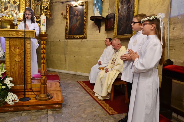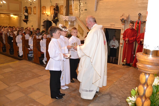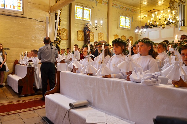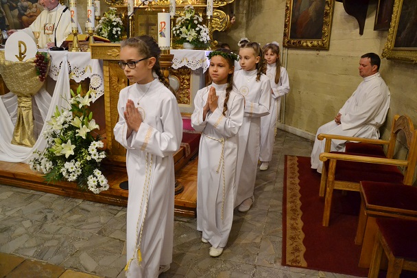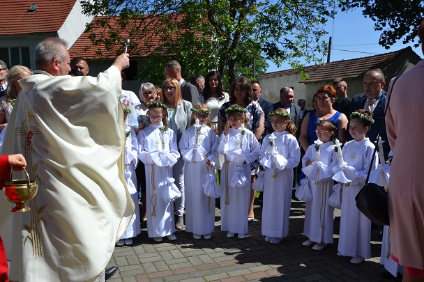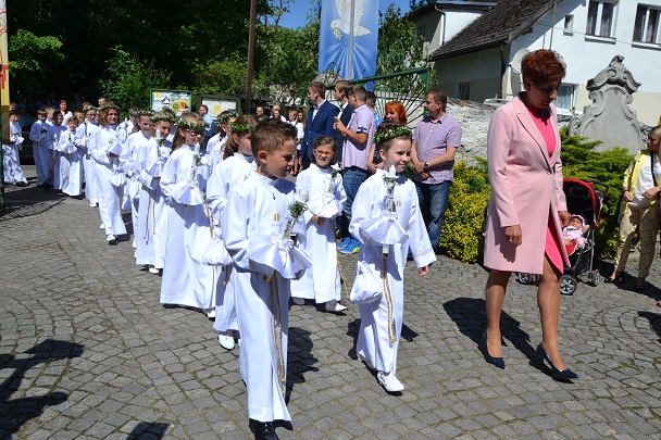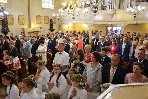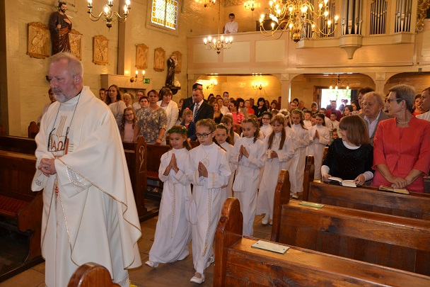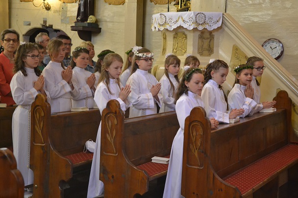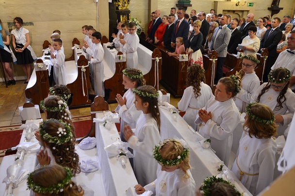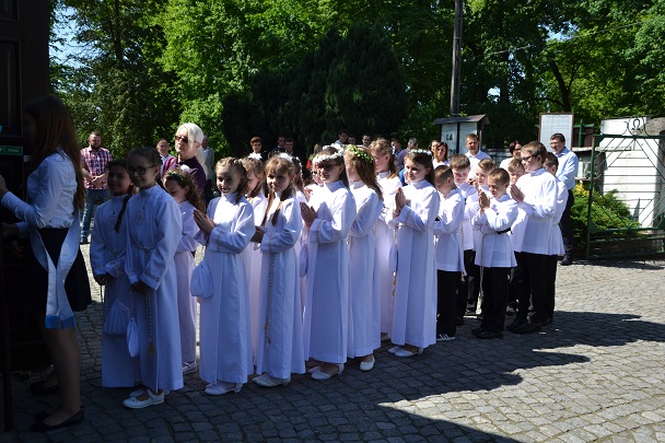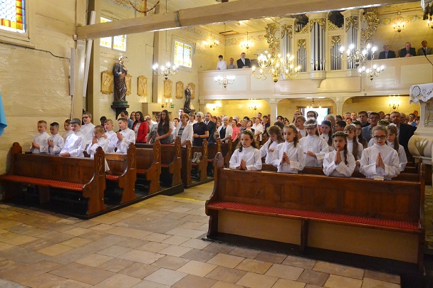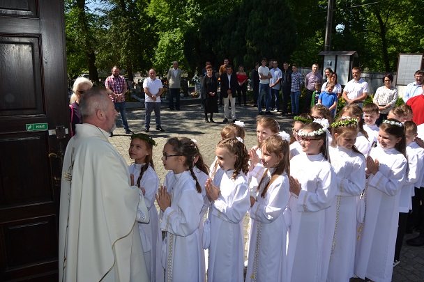 Pierwsza Komunia to wydarzenie, do którego dzieci przygotowywały się bardzo sumiennie przez cały rok, dlatego pełne emocji oczekiwały na przyjęcie Pana Jezusa do swego serca. Uroczystość rozpoczęła się na placu przed plebanią, gdzie ksiądz proboszcz Jan Palus powitał i pobłogosławił wszystkie dzieci, które procesyjnie weszły do świątyni. Rozpoczynając Mszę św. 13 maja o godz. 11.00 ksiądz proboszcz powitał wszystkie dzieci przystępujące do sakramentu Eucharystii, ich bliskich i wszystkich gości. Cała uroczystość przebiegła w podniosłej atmosferze pełnej radości i wzruszeń. Na zakończenie dzieci podziękowały pani katechetce oraz księdzu proboszczowi za przygotowanie ich do sakramentu Pierwszej Komunii Świętej.