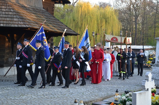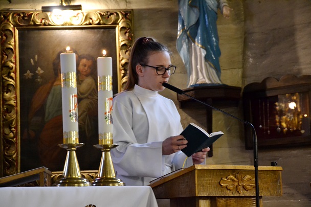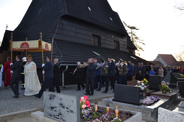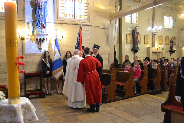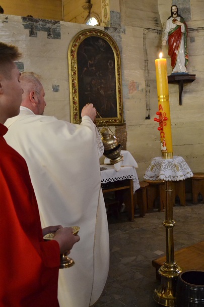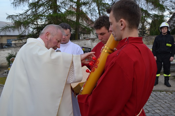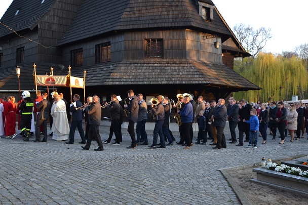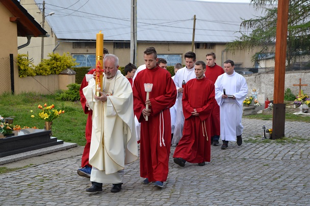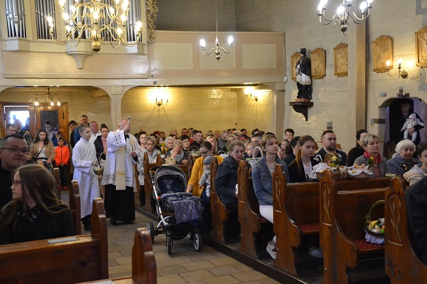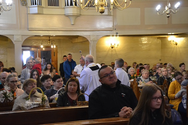 W Niedzielę Wielkanocną zgromadziliśmy się o godz. 6.00 na Mszy świętej Zmartwychwstania Pańskiego. Przed Mszą św., trzykrotnie przeszliśmy Procesją Rezurekcyjną Eucharystyczną wokół kościoła. Na Liturgię przynieśliśmy świece.