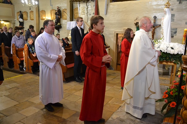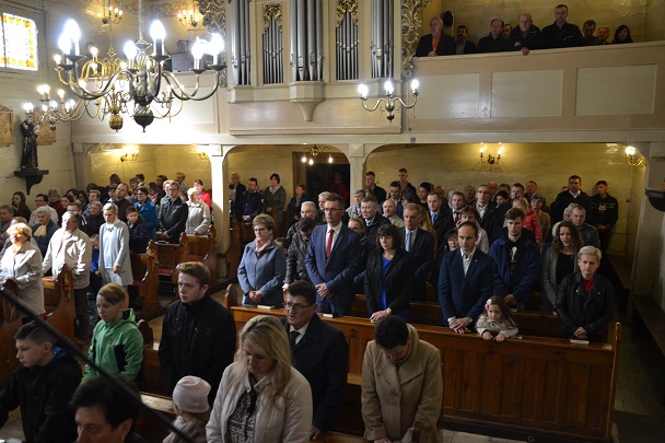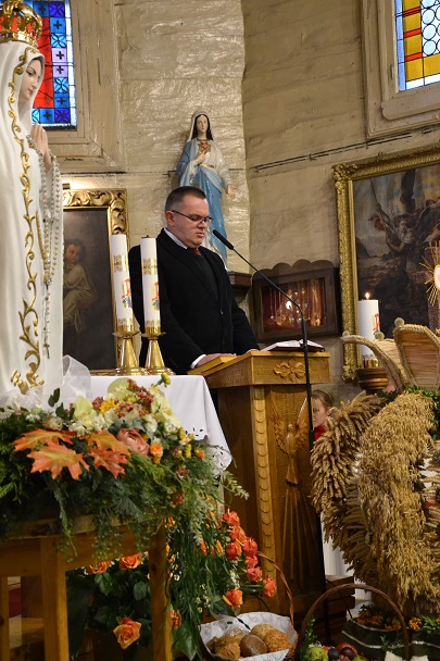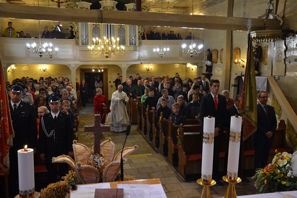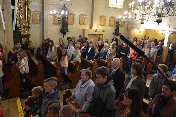 W niedzielę 13 października obchodziliśmy rocznicę poświęcenia kościoła własnego, czyli naszej parafialnej świątyni, w której gromadzimy się na modlitwie, słuchamy słowa Bożego. Każda świątynia jest miejscem wybranym przez Pana Boga, miejscem Jego przebywania wśród ludzi, miejscem spotkania Boga z człowiekiem, gdzie okazuje On swoje miłosierdzie i udziela łask. Dziękowaliśmy dzisiaj podczas uroczystej Mszy św., którą sprawował nasz proboszcz ks. Jan Palus, za ten kościół, za naszą świątynię, którą Pan Bóg wybrał na miejsce przebywania wśród nas. Rocznica poświęcenia kościoła to "dzień dziękczynienia", to dzień wyśpiewania Panu Bogu TE DEUM. Ks.Proboszcz wyraził swoją wdzięczność i podziękował wszystkim, którzy od początku do dzisiaj swoją modlitwą, ofiarą i różną pomocą przyczyniają się do utrzymania kościoła i do ciągłego umacniania Wspólnoty Parafialnej - DZIĘKUJĘ, Bóg zapłać! Niech Bóg błogosławi żyjącym, obdarza szczególnymi łaskami, a Zmarłych Dobrodziejów Parafii i kościoła - obdarzy szczęśliwością wieczną.