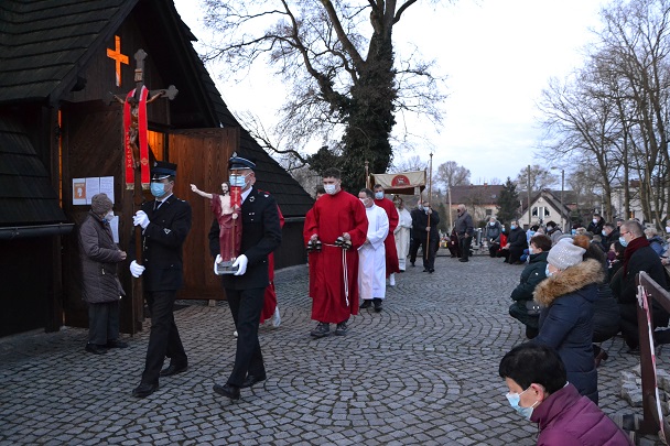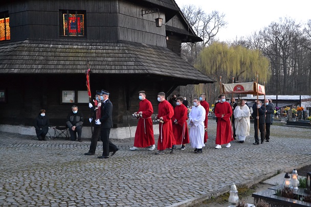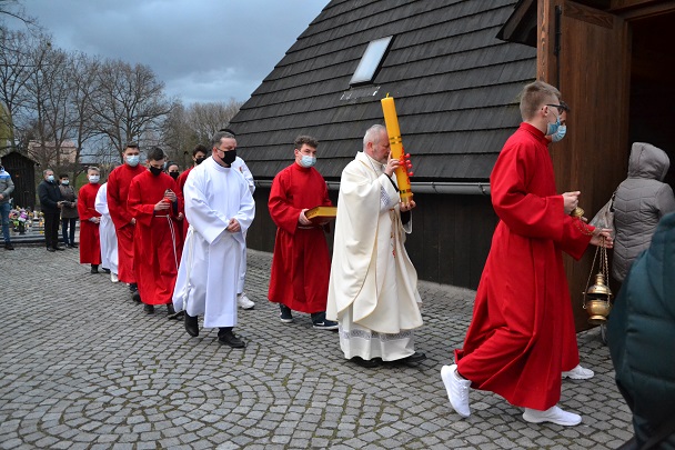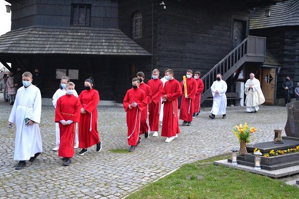 W Naszej parafii tradycyjnie, po Mszy św. o godz.6.00 wyrusza procesja rezurekcyjna naokoło kościoła , która jest uroczystą proklamacją zmartwychwstania Chrystusa i wezwaniem całego stworzenia do wielbienia Go za wszystko, co dla nas uczynił. Jednak w tym roku ze względów obostrzeń związanych z koronawirusem procesja odbyła się bez udziału wiernych.
