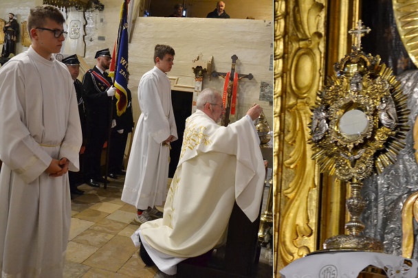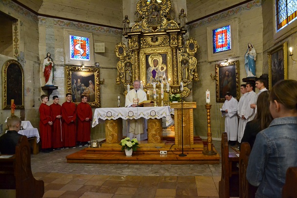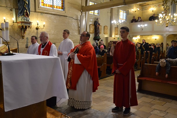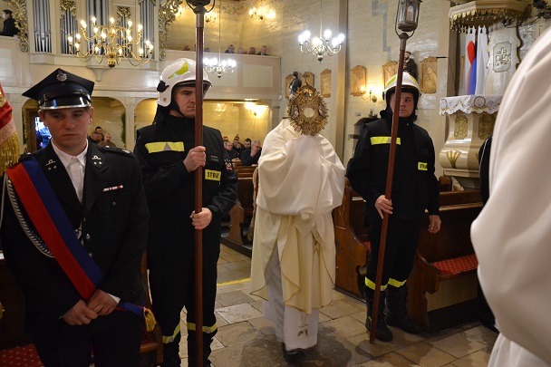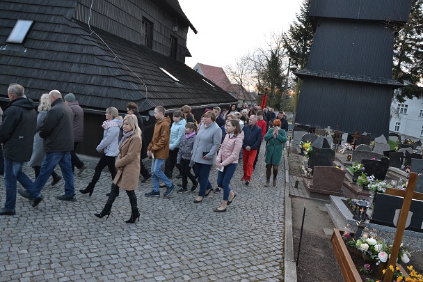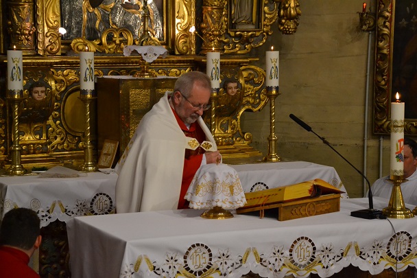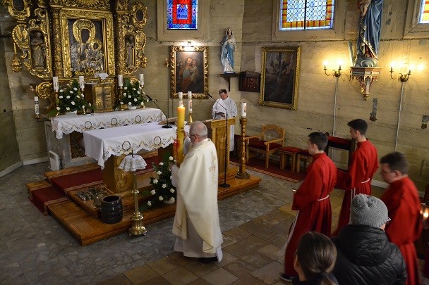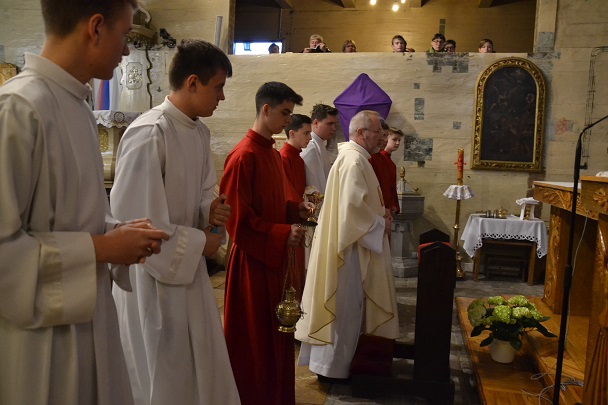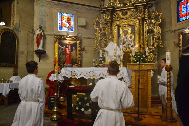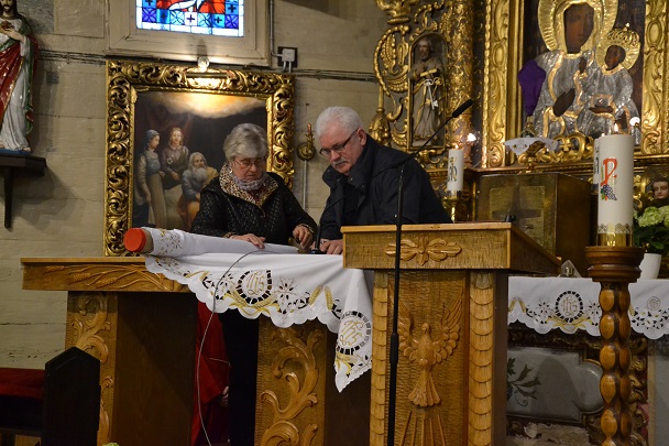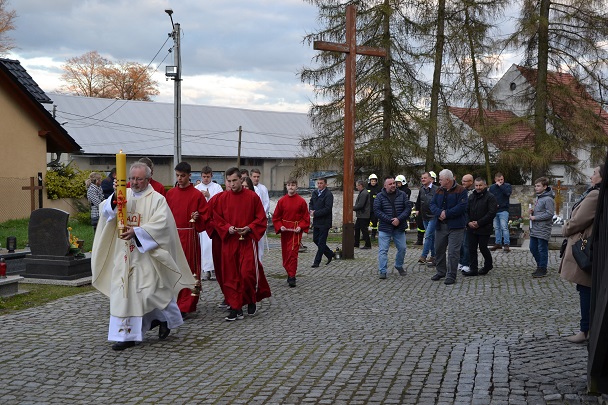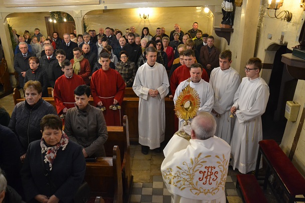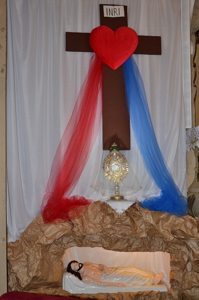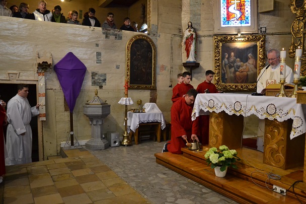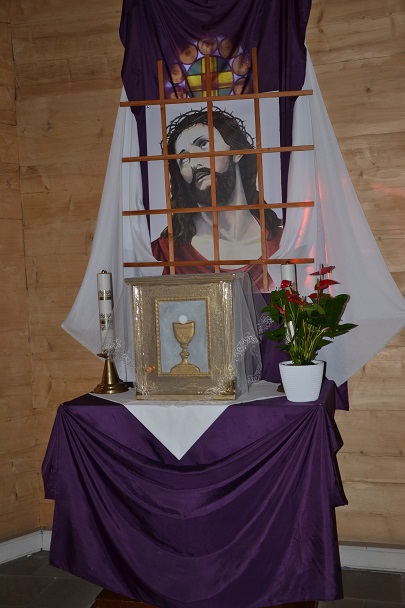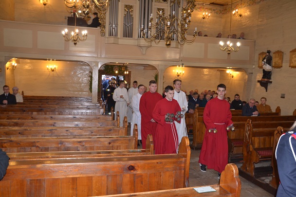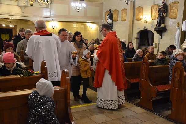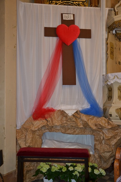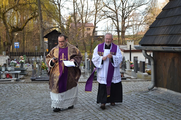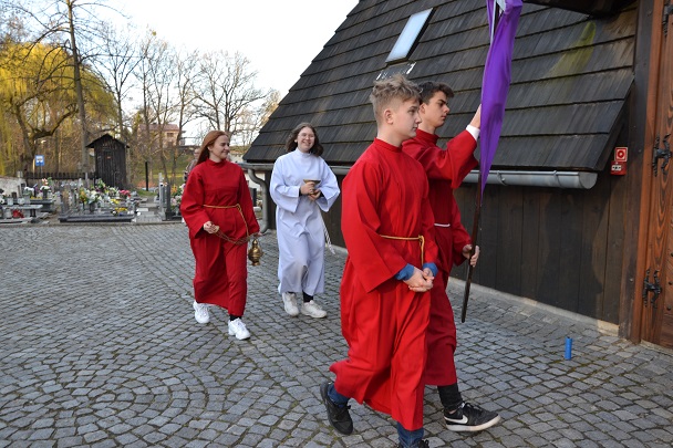 księża zakładają szaty koloru białego na pamiątkę ustanowienia sakramentu Eucharystii i kapłaństwa. O godz. 18.00 w naszej parafii była sprawowana Msza Święta Wieczerzy Pańskiej, której przewodniczył i Słowo Boże wygłosił ks. proboszcz Jan Palus. Po Mszy św. ruszyła procesja do ciemnicy. Tam rozpoczęła się adoracja Najświętszego Sakramentu. Wymownym znakiem odejścia Jezusa, który po Ostatniej Wieczerzy został pojmany, jest pozostawienie ołtarza, aż do Wigilii Paschalnej bez obrusa, świec i wszelkich ozdób.