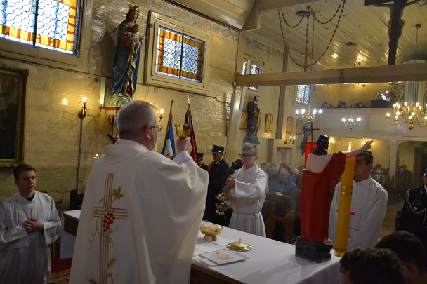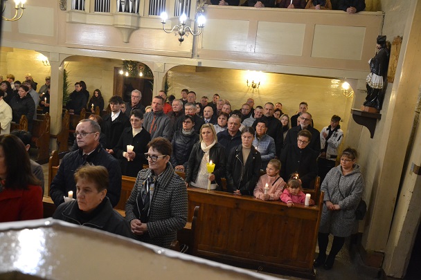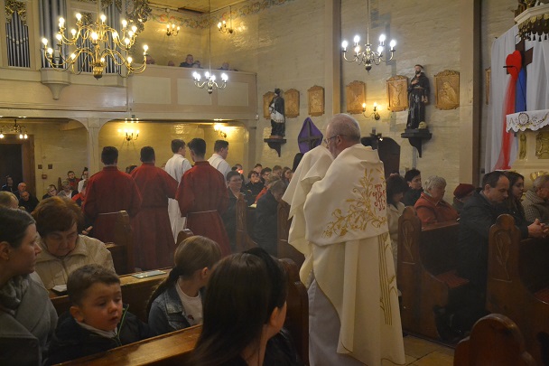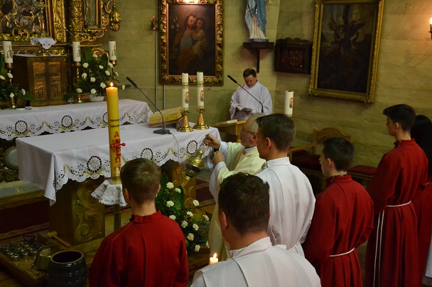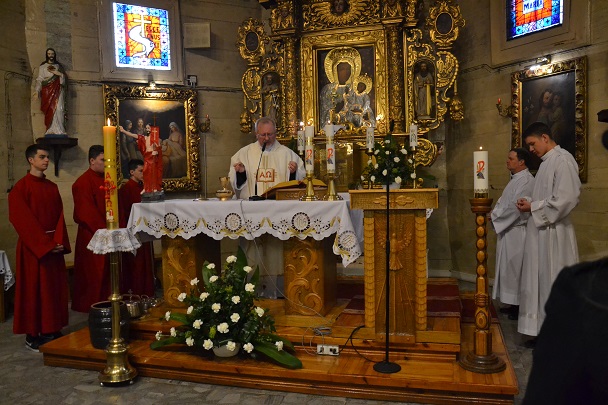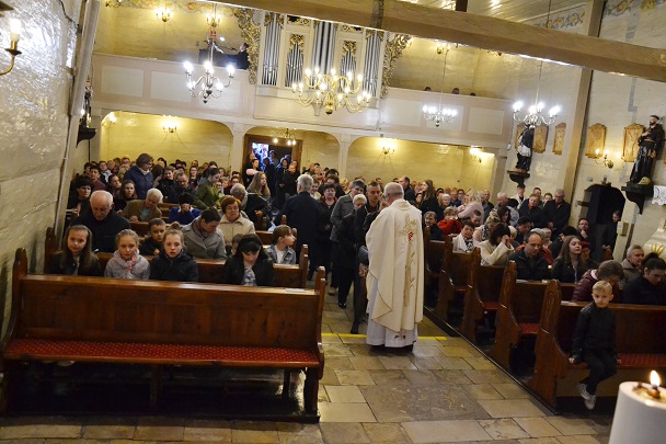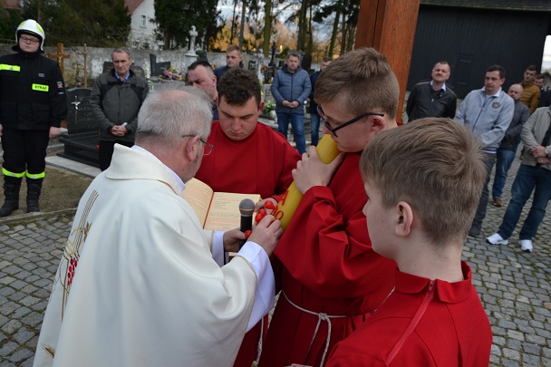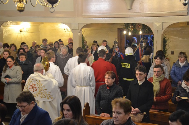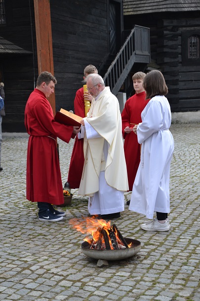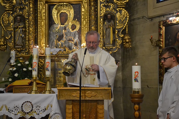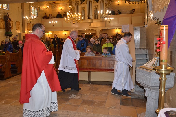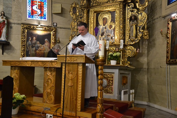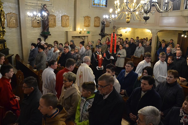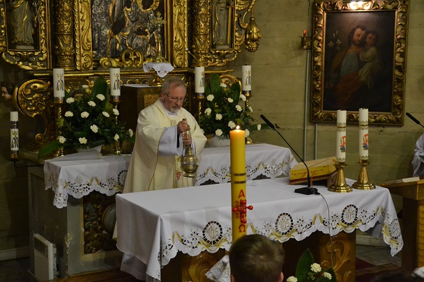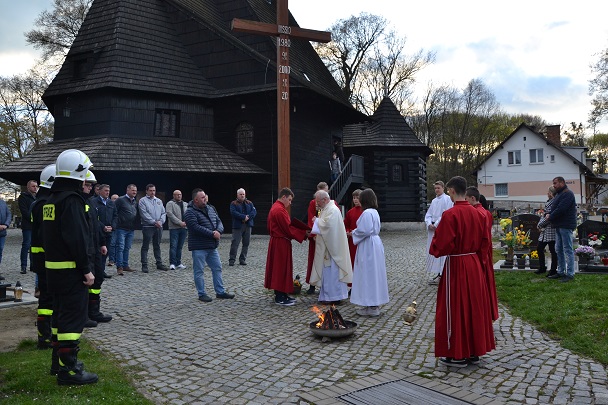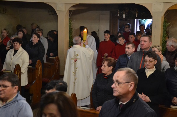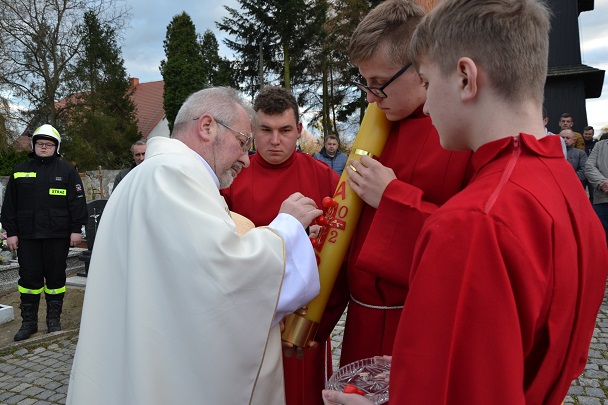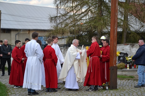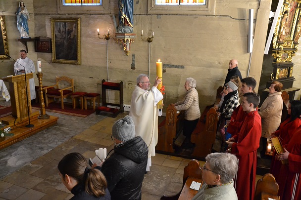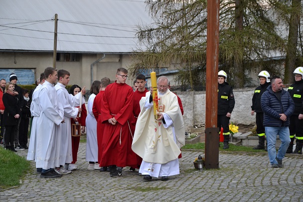 Wieczorne uroczystości Wigilii Paschalnej rozpoczęły się od Liturgii Światła, gdzie nastąpiło poświęcenie ognia, zapalenie i uroczyste wniesienie przez Ks. Proboszcza, paschału do świątyni. Następnie zostało odśpiewane Orędzie Wielkanocne, a po nim Liturgia Słowa. Homilię, wygłosił Ks. Proboszcz.