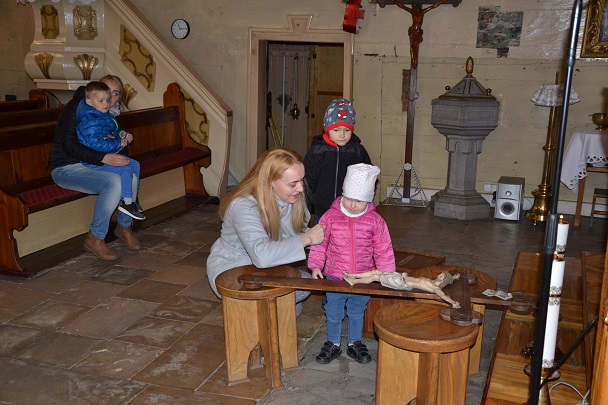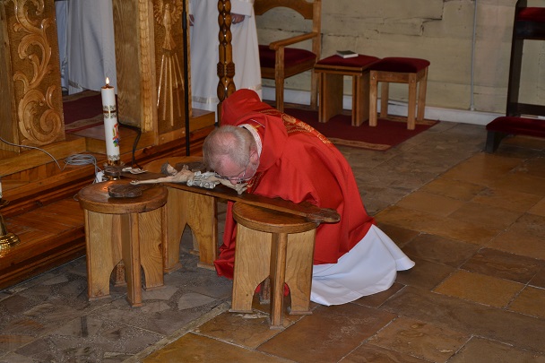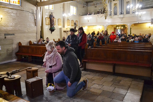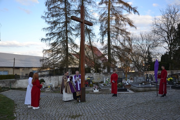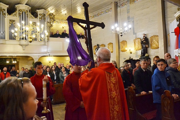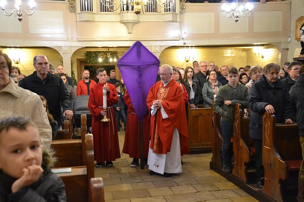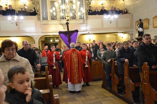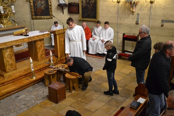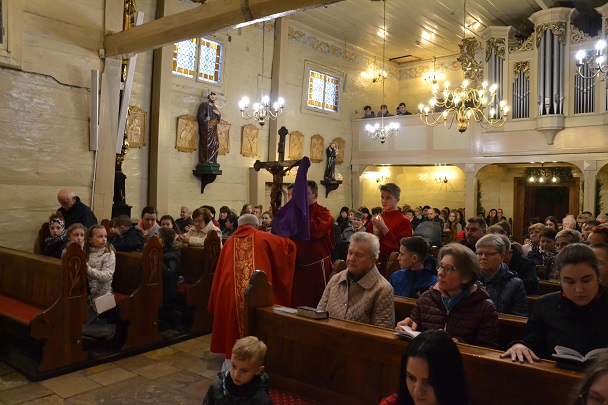 Następnie ks. Jan wniósł uroczyście krzyż od chelni do prezbiterium zatrzymując się w trzech miejscach ze śpiewem: "Oto drzewo Krzyża na którym zawisło Zbawienie świata". Przy trzecim wezwaniu spuszczono również materiał zasłaniający krzyż w prezbiterium. Po oddaniu czci Krzyżowi przez Ks.Proboszcza rozpoczęła się Adoracja przez wszystkich wiernych. Podchodzili oni oddawali cześć Krzyżowi poprzez ucałowanie.