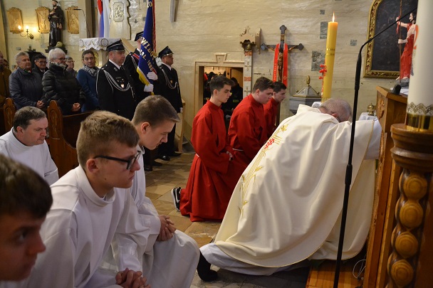 Ks. Proboszcz po dojściu do ołtarza upadł na twarz w geście uniżenia się człowieka oraz smutku i bólu Kościoła.