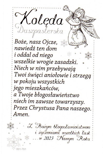 W tym roku, w naszej parafii, zostały odwołane duszpasterskie wizyty kolędowe w tradycyjnej formie. Od 27 grudnia 2022r. do 19 stycznia 2023r. były sprawowane Msze św. kolędowe w intencji mieszkańców naszej parafii.