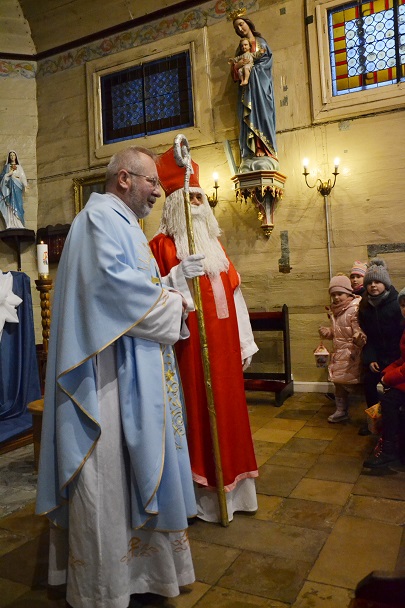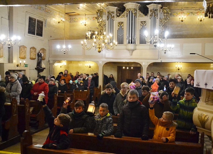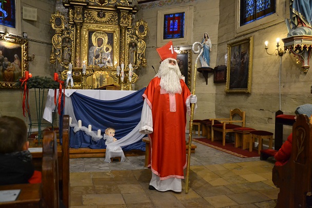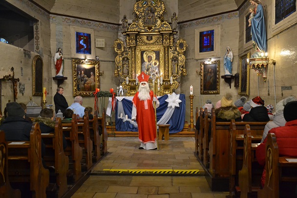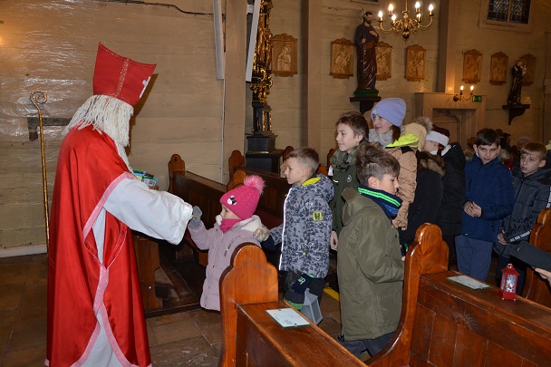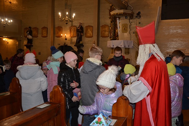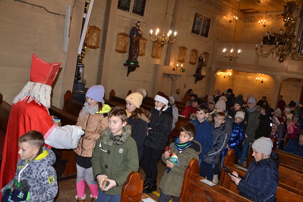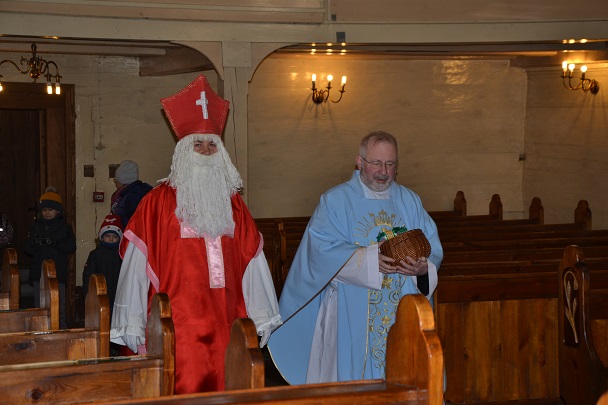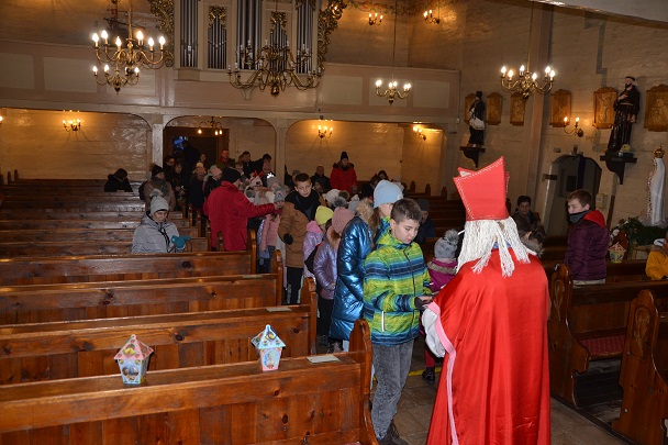 Bardzo szczególnym elementem tej liturgii– ku wielkiej radości dzieci – była wizyta samego św. Mikołaja, który przebył wiele kilometrów, aby spotkać się z wszystkimi uczestnikami Rorat. Wszedł do kościoła wprowadzając świąteczną atmosferę. Korzystając z okazji św. Mikołaj zagadnął też dzieci o właśnie przeżywany czas Adwentu i obecność na roratach. Nie zabrakło też pytań o miniony rok, czy wszystkie dzieci były grzeczne i czy słuchają swoich rodziców. Na koniec wizyty św. Mikołaj obdarował wszystkie dzieci słodkimi upominkami.