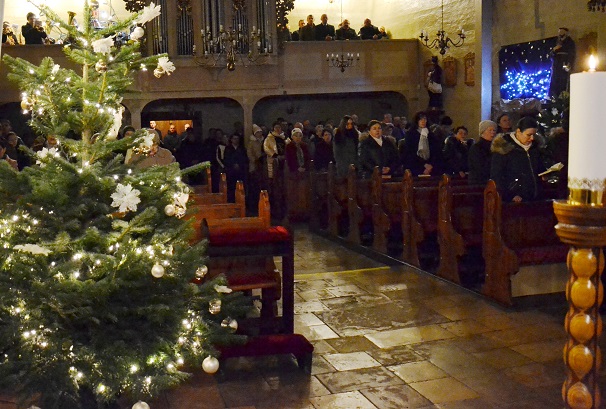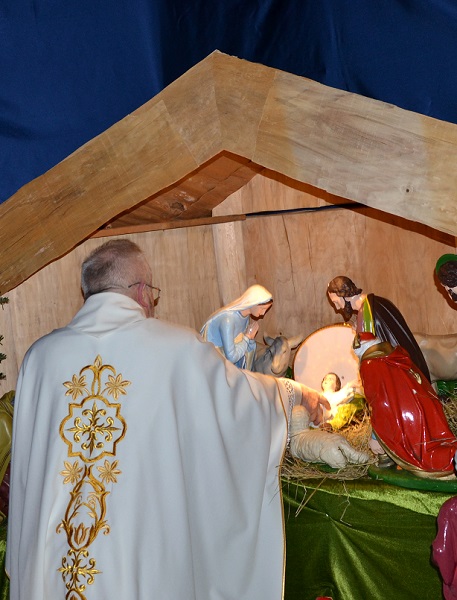 Pasterka rozpoczęła się wniesieniem figurki Dzieciątka Jezus, którą ks. proboszcz złożył do żłóbka, a w kościele rozbłysły światła.