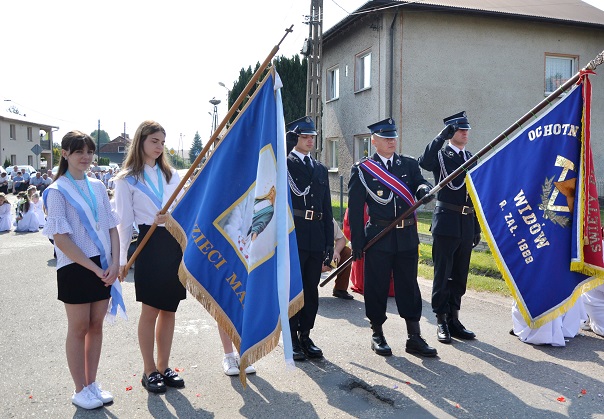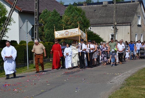 Wyjątkowy to również dzień dla parafian z Widowa, którzy tradycyjnie wyruszają sprzed kapliczki i procesją idą do naszego kościoła parafialnego w Poniszowicach, gdzie o godz. 8.00 odprawiona została Msza św. w intencji żyjących i zmarłych parafian z Widowa. Mszy św. przewodniczył ks. Waldemar Jaskóła. Po uroczystej Eucharystii wyruszyła procesja Bożego Ciała do czterech ołtarzy, które zostały przygotowane przez poszczególne wioski naszej parafii: : I - Słupsko, II - Poniszowice, III - Niekarmia, IV - Niewiesze. Druhowie OSP Widów nieśli baldachim nad Najświętszym Sakramentem. Przy każdym ołtarzu odczytywane były fragmenty Ewangelii mówiące o Eucharystii. Ponadto w przebieg procesji zaangażowało się wielu naszych parafian. Warto wymienić: dziewczynki sypiące kwiaty oraz dzieci Pierwszokomunijne w białych strojach, orkiestrę, poczty sztandarowe, chłopców niosących krzyż, Liturgiczną Służbę Ołtarza. Należy również wspomnieć o przepięknie przystrojonych posesjach na trasie procesji. Wszędzie przykuwały uwagę, przystrojone symbolami religijnymi okna.