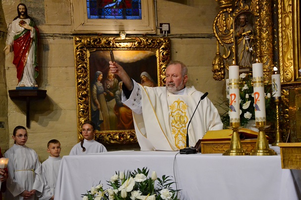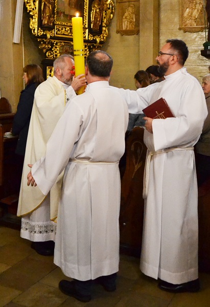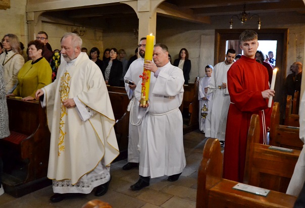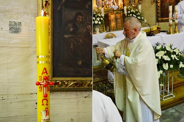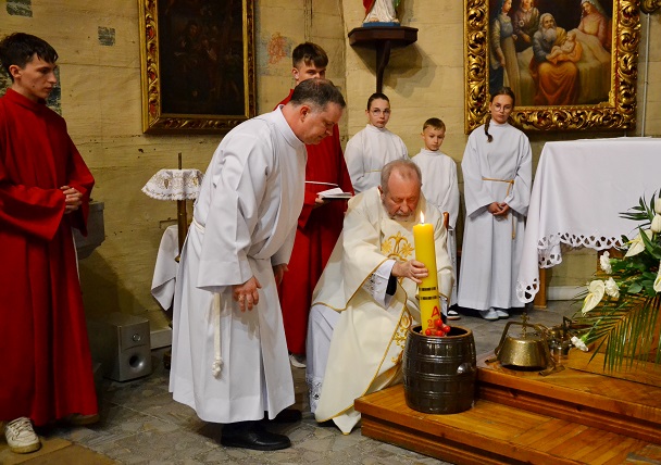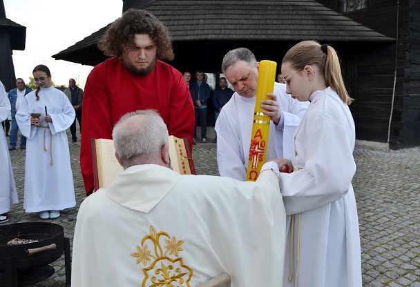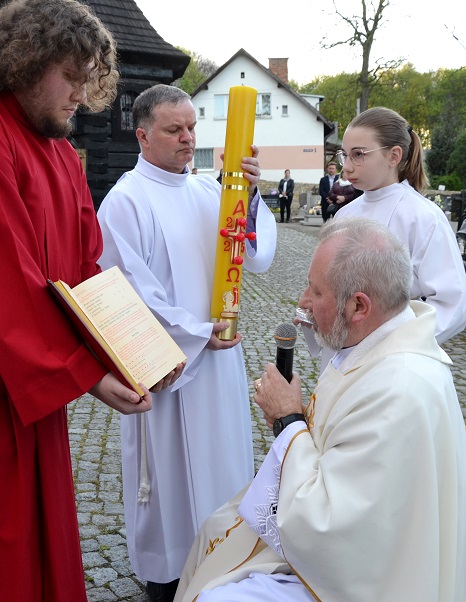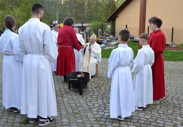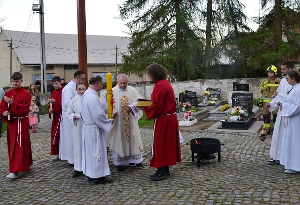 o godz. 19.00 rozpoczęliśmy Liturgię Wigilii Paschalnej. Najpierw miało miejsce poświęcenie ognia i paschału, następnie wniesiony został ten paschał do ciemnej świątyni i jego blask stopniowo rozproszył ciemności kościoła. Potem rozpoczynają się obchody Wigilii Paschalnej, które formalnie należą już do Niedzieli Zmartwychwstania Pańskiego.
