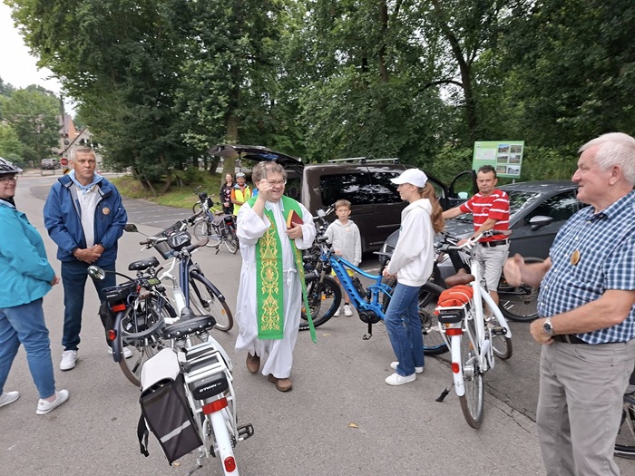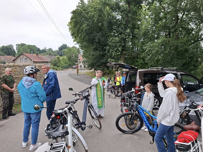 Na odpust, na Górze św. Anny po raz dwunasty pojechała pielgrzymka rowerowa z naszej parafii. Wszyscy uczestnicy zasługują na pochwałę i szacunek, a podziękowania należą się wszystkim, którzy przyczynili się do zorganizowania tej pielgrzymki, ale nie sposób nie wymienić tutaj zaangażowania, przede wszystkim Leona Kocura z żoną Bogusią. To ich zapał i poświęcenie czasu, prowadzi do realizacji każdej kolejnej wyprawy rowerowej. W tym roku 27 lipca, przed kościołem w Poniszowicach , koło 7.00 rano, zebrała się spora grupa rowerzystów, aby uczestniczyć w pielgrzymce rowerowej na Górę św. Anny. W tym roku pobłogosławił pielgrzymów ks. Waldemar Jaskóła.